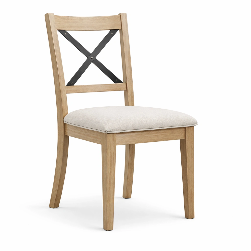 Esta silla cuenta con una estructura de madera de roble, respaldo de metal en forma de X y un asiento tapizado en tela de poliéster beige. La silla tiene unas dimensiones de 45 cm de ancho, 50 cm de profundidad y 85 cm de altura y puede soportar un peso máximo de 100 kg.