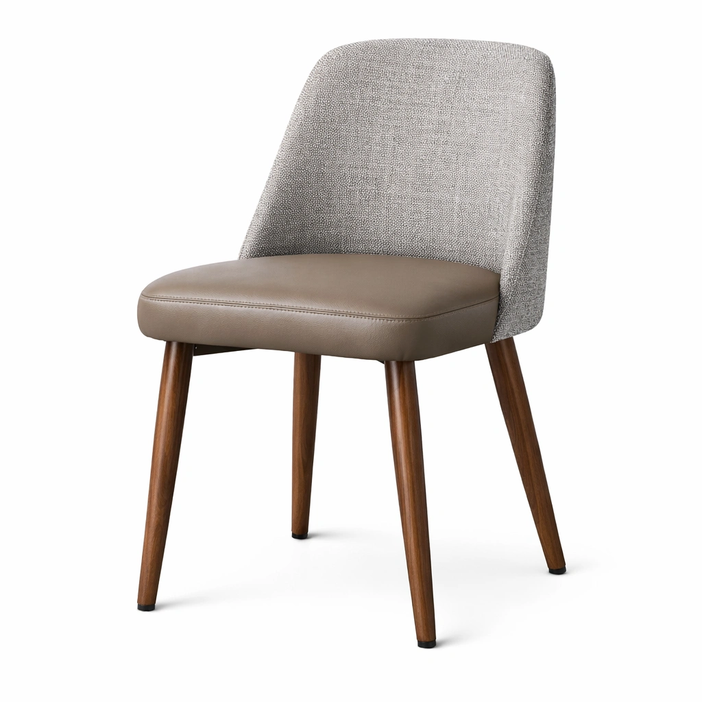 La silla tiene una estructura de madera robusta. El asiento está tapizado en cuero sintético y el respaldo en tela de poliéster. Capacidad de carga de 120 kg.